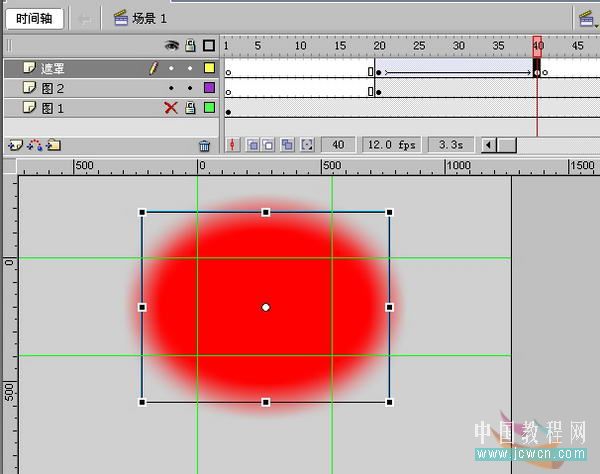 B、在第40帧插入关键帧,用任意变形工具把矩形拉大复盖整个舞台。