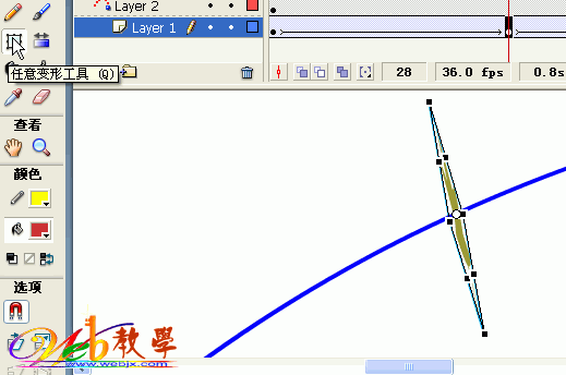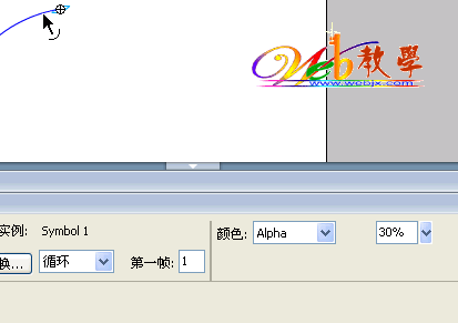 之后新建一个影片,然后把叶子拖到场景中,插入一个运动向导层,用钢笔工具绘制一条弯曲的曲线: