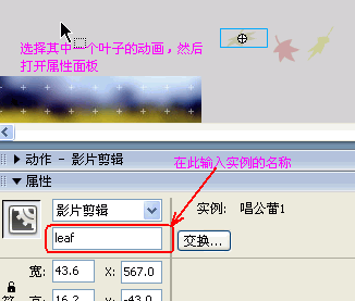 最后回到场景中,插入两个新的图层,选择图层2,然后按CTRL L打开库面板,把制作好的三个叶子飘落的动画拖到舞台中,分别选择3个叶子的动画给它们命名实例名字为leaf、leaftwo、leafthree,其中命名的方法如下图:
