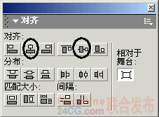 3、回到主场景,按快捷键Ctrl L打开“库”面板,把“库“中的“影片”元件拖放到场景1中。点选场景1中的“影片”元件,按快捷键Ctrl K打开“对齐”面板,点选“相对与舞台”按钮,然后再点击“水平对齐”和“垂直对齐”两个按钮(如图3所示),使影片“元件”在居中于场景内。