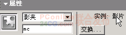 4、点选场景1中的“影片”元件,在“属性”面板为其起个实例名为mc,如图4所示。再点选第1帧,按一下F5键插入1帧。