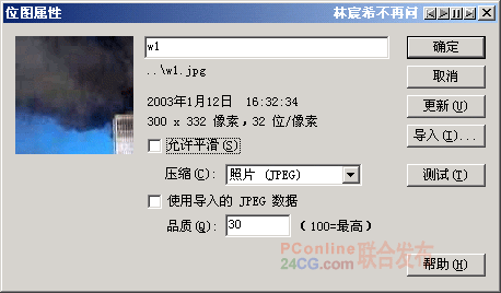 7、按快捷键Ctrl L打开“库”,双击“库”中的图片,并如图5所示设置弹出的“位图”属性面板。这样设置是为了减小SWF文件的体积。