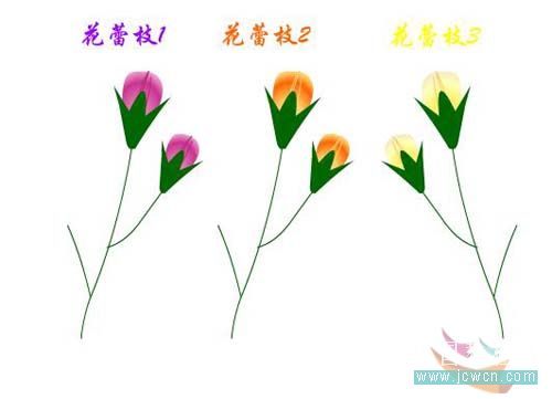 2、用同样的方法制作“花枝2、”“花枝3”和“花蕾枝1”、“花蕾枝2”、“花蕾枝3”,如图所示: