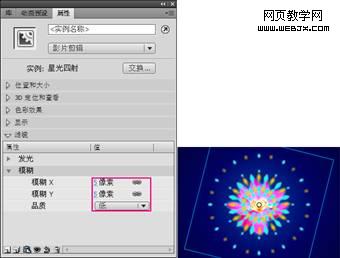 图4-116调整颜色并选择图形(11)选中“蓝色星光四射”图层中的影片剪辑,然后在属性面板中为其添加“模糊”滤镜,具体参数设置如图4-17所示。