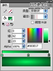 实例步骤:(1)新建一个空白文档,舞台大小设置为500*250,帧频设置为120,绘制一个与舞台大小同样大小的矩形,并填充放射状渐变色,设置第一色标颜色为(R:0,G:246,B:93)Alpha: 100%,设置第二色标颜色为(R:0,G:131,B:49)Alpha: 100% ,设置第三色标颜色为(R:0,G:62,B:23)Alpha: 100% ,如下图15-1所示。