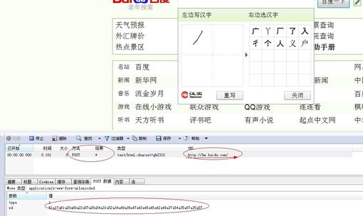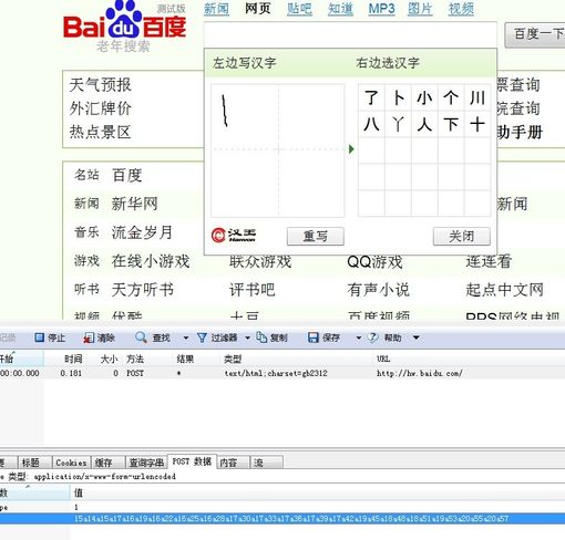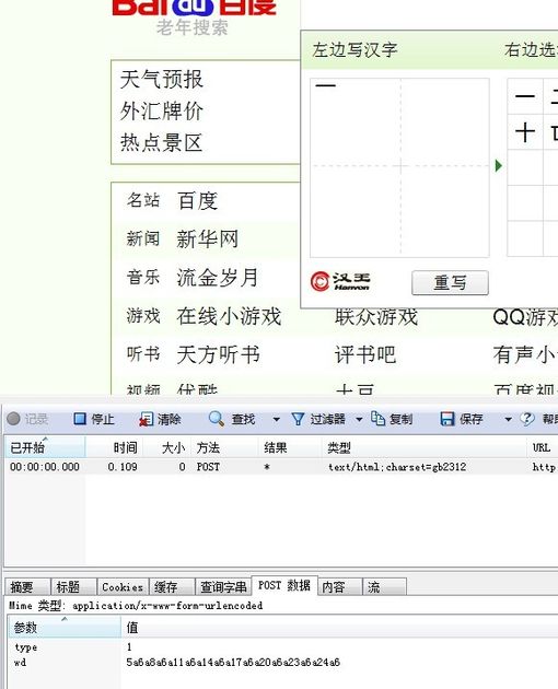 因为我之前就分析了,flash是做表现层的,底层的肯定不是由flash来弄的,所以注定了它是有数据读写的,所以在好奇之心的驱动下,我开启了我浏览器中的HttpWatch,然后就试着随便写写,发现了swf真的post了数据给一个地址http://hw.baidu.com/ ,大家可以打开这个链接看看,网页里就是 {"s":"","t":3}这几个内容,貌似和我们的手写数据没有任何关联,其实不是这样的,因为我们单独打开是没有传入任何参数进去的,所以给人错觉了