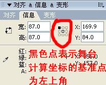 那么由此可见,FLASH软件操作界面中的计算坐标的方式和AS并不一样,但是起码来说我们现在能找到一个共同点:也就是不管舞台中信息面板中设置元件坐标计算的基准点是左上角还是元件的中心,AS计算坐标的基准点始终是元件的十字心。那让他们的坐标一样用很简单的一个办法就是把你建立的元件的注册点都设置成左上角,然后再信息面板的九宫格也点选左上角,那么AS计算的十字注册点和软件操作界面计算的元件坐标的基准点为同一点,那么他们的结果就一样。