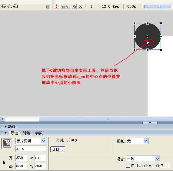 我们摁下Q键切换到自由变形工具,然后当把我们把光标移动到a_mc的中心点的位置并拖动中心点的小圆圈,我们发现当我们的小圆圈改变位置的时候,软件操作界面下的X,Y坐标发生了变化: