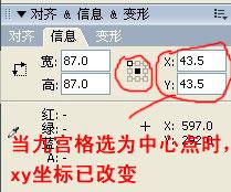同理,如果你建立的影片剪辑的十字注册点在元件的中心,那么信息面板的九宫格也点选中心点,那么AS计算的十字注册点和软件操作界面计算的元件的中心点为同一点,那么他们的结果就一样。