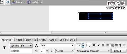 4、双击这个影片剪辑编辑它,使用文本工具,设置为动态文本,绘制一个区域,设置颜色是白色,命名实例名为abelBtn。