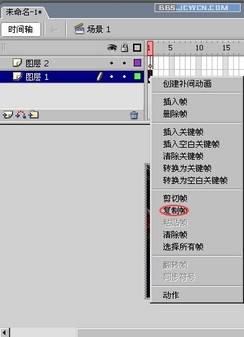 5、增加图层2 ,右键点图层1 的第1 帧--复制帧,右键点图层2 的第1 帧,粘贴帧。