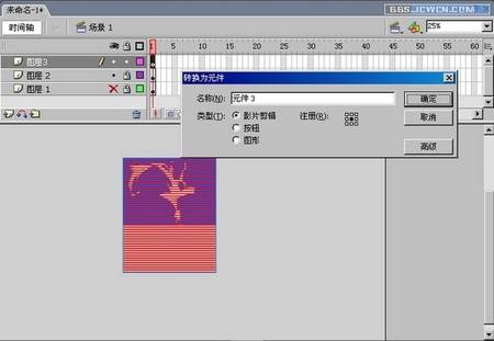 12、所有矩形为画面的1.2倍左右的时候,把舞台调整为25% ,用箭头工具把所有的矩形及图片括起来,点对齐面版上的水平对齐,Ctrl+G 组合所有矩形,把它转为元件3,类型:影片剪辑。