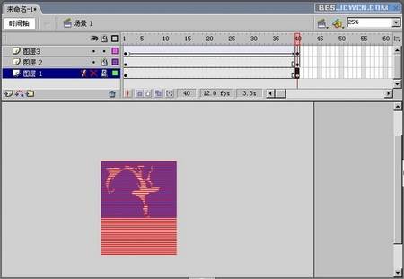 14、在第40帧,用小键盘的方向键移动元件3 ,使元件3 和舞台上对齐。并分别在图层1、图层2 的第40帧插入关键帧。
