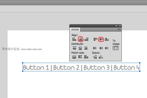 第一步:创建文本新建一个600*300px的Flash Actionscript3.0文件,首先,选择文本工具并输入你的导航菜单文字,在这个教程中,我用的是Button1|Button2|Button3|Button4,字体选择Arista Light,大小为30点,颜色选择#999999.然后进入对齐面板(如果你看不到它的话就点击窗口>对齐),使文本相对于舞台水平中齐,垂直中齐。