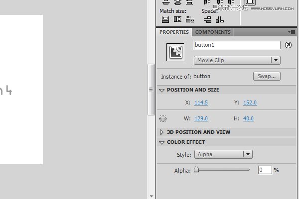 然后,在属性面板中,将其实例名称命为button1″并将alpha值设为0%。