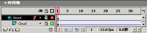 5.在继续往下做之前我们还需要考虑一下,本实例是利用遮罩技术来实现的,所以遮罩层的位置一定要设置正确,光影字的最终效果是一片光影在文字上流动,所以根据这点可以确定遮罩层应该是含有文字的Word层,制造光影效果的图层应该是被遮罩层,也就是下面的cloud层,这一关键问题确定后,我们就可以继续了.