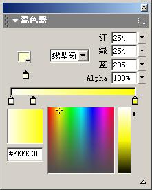 3.新建一图形元件“字符光亮”,在第1帧处插入一关键帧,使用文本工具,其相关设置与第2步一样,在工作区中输入同样的文本,并使用分离命令将输入的文本分离,然后打开混色器面板,进行如图3所示的设置: