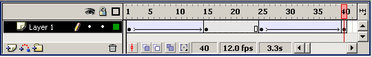 分别在第25帧和第40帧,插入两创建关键帧,并在25帧和第40帧之间创建相反的运动激变动画,即由一条线放大。时间轴如图4.3.5所示:
