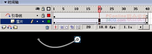 4.右键单击“雪片”层,在弹出的菜单中选择“添加引导层”命令为“雪片”层建立一个引导层,如图2所示。在引导层里画一条曲线,将第1和第40帧的“雪片”元件吸附在曲线的左端,第20帧的“雪片”元件吸附在曲线的右端。如图3所示(此图为400%显示