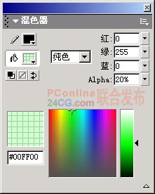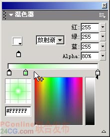 2.按快捷键Shift+F9打开“混色器”面板,如图2所示进行设置。其中,3个滑块的颜色分别是(从左至右)#FFFFFF、#54FF4B、#FFFFFF。Alpha值分别为80%、70%和0%。当鼠标变成图2所示的样子时,单击左键就可以添加一个滑块。按住滑块拖出面板,再松开鼠标左键,即可删除滑块。