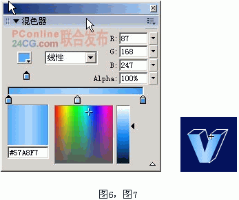 7.点选“颜料桶”工具,按快捷键Shift+F9打开“混色器”面板,如图6所示设置。图6中三个滑块的颜色分别为#57A8F7、#AFD6FA和#3997F4,Alpha值均为100%。用鼠标左键按住滑块拖出面板后松开即可删除滑块。设置好“混色器”面板后,用“颜料桶”工具点击字母“V”的正面着色。如图7所示。