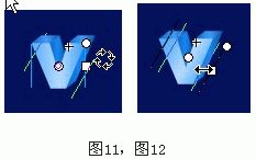 ,点击字母的正面,并拖动白色空心小圆圈(旋转渐变控制点)进行旋转。如图11所示。拖动白色空心小方块(范围渐变控制点)进行调节。如图12所示。这样调节的作用是使色彩过渡更加细腻,更有质感。