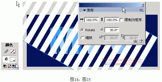 15.把库中的“光线”元件拖拽到“文字遮罩”层中。按快捷键Ctrl+T打开“变形”面板,并如图15所示进行设置。右键点击“文字遮罩”层,点选“遮罩”命令。