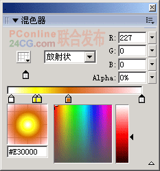 2.按快捷键Ctrl+F8新建一个名为LaserLight的元件,将“图层1”更名为Laser Source。如图12所示设置“混色器”面板,其中5个滑块的颜色分别为#FFFFFF、#FFFF00、#FFFF26、#CC6600、#E30000,前四个滑块的Alpha值都为100%,最右边滑块的Alpha值为0%。使用“椭圆”工具在场景中绘制一个圆。