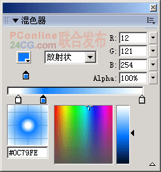 5.设计彗头。新建一个名为CometLight的元件。将“图层1”更名为CometSource。并在该层的场景中绘制一个圆,点选该圆,并如图13所示设置“混色器”面板,其中3个滑块的颜色为#FFFFFF、#0C79FE、#3394D1,第3个滑块的Alpha值为0%。点选“颜料桶”工具,点击改圆的右下角,即将高光打在该圆的右下角。