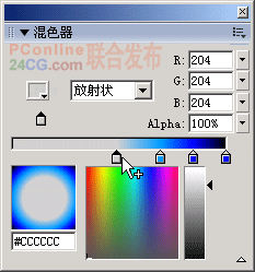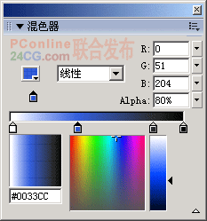 在Flash画法中,点光源比较偏向于发射状,所以一般用“线性渐变填充”,图2中所示彗星的慧头通过四种颜色来勾勒:最靠近光源内部的属于基准光,通常是白色(#FFFFFF);第二种是过渡光(#CAF1FB),也就是光源的辅助色,用于光源主色调与内部色的自然过渡;与其相邻的就是光源主色调(#3394D1);最后一种颜色是辉光(#3394D1),一般和主色调相同,但Alpha值比较小,甚至为零,用于表现光芒的柔和效果。“混色器”面板设置如图5所示。