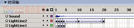 3.新建一个名为TopLight的影片剪辑。将LaserLight和LaserLight2分别放置在不同层中的第20帧中,然后均在第30帧插入关键帧,将两者同等比例缩小至适当尺寸,并将Aplha值均设置为0%。最后建立“运动补间”动画即可。