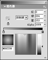 2、新建一个图形元件,命名为bb,进入元件的编辑区后,打开混色器面板,在填充样式下拉列表中选择填充类型为“放射渐变”,然后分别设置色带下左右两个滑块的颜色,其中左边滑块颜色为绿色,RGB颜色代码为0、204、153,右边滑块颜色为黑色,设置好填充色后,选择椭圆工具,按下“Shift”键的同时在编辑区绘制一个正圆。
