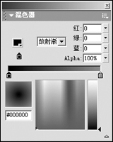 4、回到主场景中,首先给影片制作一个背景。打开混色器面板,在填充样式下拉列表中选择填充类型为“放射渐变”,然后分别设置色带下左右两个滑块的颜色,其中左边滑块颜色为黑色,右边滑块颜色为绿色,RGB颜色代码为0、135、8。设置好填充色后,选择矩形工具,在舞台中绘制一个方形,大小稍稍超过舞台大小即可。