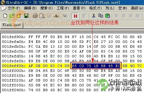 方法是运行16进制文件编辑器UltraEdit-32,点击“搜索”菜单下的“查找”选项,在出现的“查找”对话框中的“查找什么”栏中填入:85C0751B8B45EC,会找到两处结果(图2),找到后将它们都修改为:85C0EB1B8B45EC,然后保存修改结果,退出UltraEdit-32,这样你就拥有了一个无坚不摧地Flash.exe文件了!现在,无论是带有密码保护的swf文件,还是有功能限制的swf文件,都挡不住你了。运行Flash.exe,然后点击“文件”→“打开”菜单,找到你想看的swf动画,不会有任何提示就可以打开该动画,点击“控制”菜单下的“播放”,或直接按回车键就可以观看该动画!
