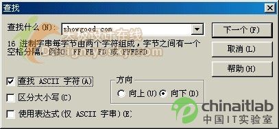 本着这个思路,用UltraEdit-32打开开篇中提到的“浪花一朵朵”这个动画(langhuaduoduo.swf),按Alt+F3搜索:showgood.com,注意在“查找”对话框的“查找ASCII字符”选项前一定要打上“√”(图3)。