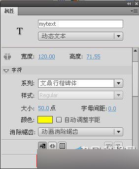 1、新建Flash(AS3)文件,在库中新建一个影片剪辑元件,画一个动态文本(不用打入文字),命名为mytext,其它选项根据需要设置,如下图所示: