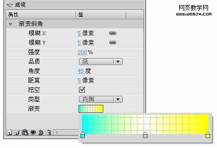 (10)选中“连接线”在“属性”面板中添加“渐变斜角”滤镜,渐变色为“青色”和“黄色”参数如图1-9所示。