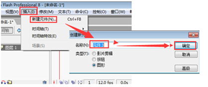 5、以上三种元件几乎可以囊括flash动画制作的所需的所有类型的素材,当然每种类型的元件并不是相互孤立的,他们彼此之间很多时候是相互联系的。那么如何创建这三种元件呢,看如图所示:
