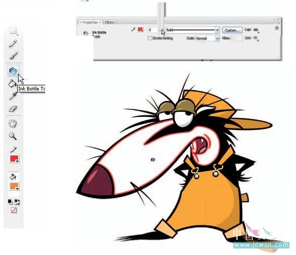 1. 开始使用墨水瓶工具(I)并选择一个与你的设计中任何一处都不相同的颜色。设置线条颜色粗细在3到4左右。在填充内点击,用你选择的颜色为它添加轮廓线。不要担心它能被看见,因为最终在你完成时,你将删除这些线条。