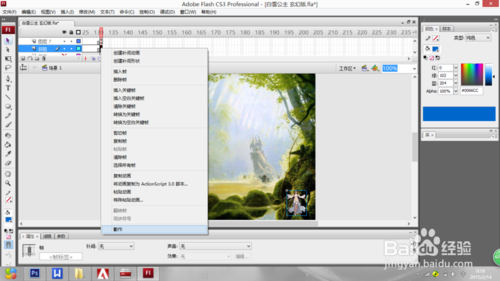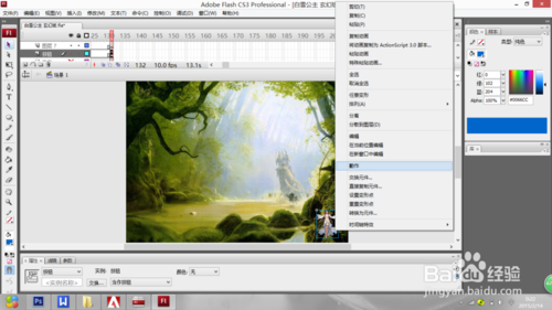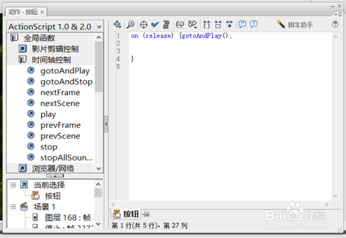 5、之后给按钮元件插入动作,具体操作如下:(1)将鼠标指针放在按钮元件上[注意:此处不是帧上面,是元件上面,如图所示的];(2)点击鼠标右键,再出现的菜单中选择动作,再选择影片剪辑控制,之后点击on,点击on之后,会在右侧框中出现菜单,再选择release,之后点击中括号内部,然后回到左侧,选择时间轴控制中的gotoAndPlay,之后右侧框中会出现括号,在括号里面输入你想开始的帧就好。如图所示:
