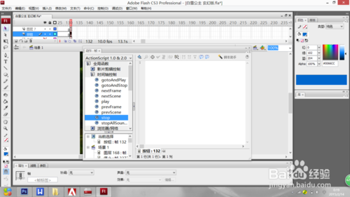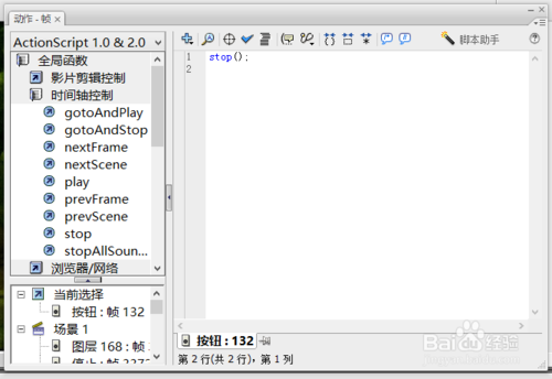 3、返回场景,新建按钮图层,在需要插入按钮的那一帧插入停止动作,具体做法如下:(1) 将鼠标指针放在需要停止的帧上;(2)单击鼠标右键,再出现的菜单中选择动作,之后打开动作中的全局函数,再选择时间轴控制,最后点击Stop,之后将其关闭。注意事项,只有关键帧才可以插动作,如果不是,请将此帧转换为关键帧,选中该帧,按F6即可转换。如图所示: