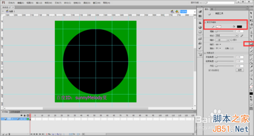3、我们先进舞台颜色换一下,大家换一个自己喜欢的颜色就好,小编选择的是绿色,大家在选择时最好不要选择黑白色,因为太极图是黑白的嘛;再选择椭圆工具,将笔触设置为无,填充设置为黑色,按住shift+Alt键,鼠标点击正中心拖出一个正圆。