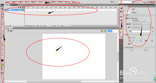 3、它的功能区是由:时间轴、工具箱、属性、库、工作区等组成,如图2-1所示: