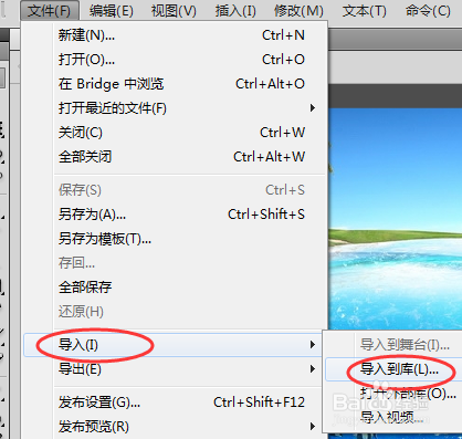 点【文件】 找到 【导入】,会出现一列小菜单,然后点【导入到舞台】或【导入到库】都可以,如图