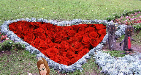 最后一个场景就是在摆满玖玫花的心形地面上的,刚开始找到图时,上面的心形图案是别的杂草,我又想着剧情又想着喜庆一点,就大胆地又找了一张有玖玫花的图,然后将这两张叠放在一起,最后将玖玫花那张图分离,扣图,再组合,最终完成了这现在效果。