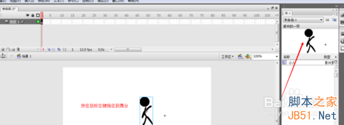 第三步是回到舞台,然后把库中的影片剪辑(你的小人)拖动到舞台上。