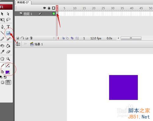 首先选中时间轴第一帧——按矩形工具在舞台上制作一个矩形图案——记得去掉线条工具,因为线条是不会随填充变形的,影响美观,把矩形打散。