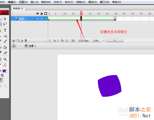 在时间轴中间用右键点击鼠标插入形状补间,不是动画补间哦。