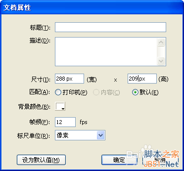 首先新建一个Flash文档。然后在弹出的对话框中设置大小为288像素×209像素。背景颜色为白色等内容。
