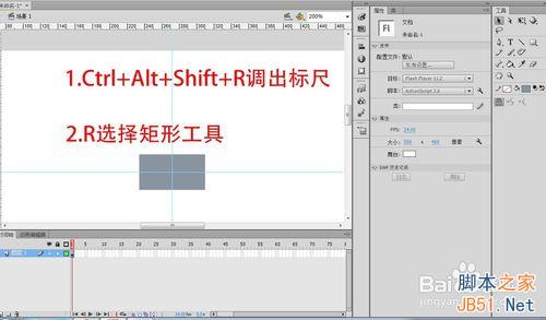 1、启动Flash,按”Ctrl+Alt+Shift+r“打开标尺,然后拉出几个参考线。这一步是为了让绘画更精准,当然了不用参考线也一样能画。